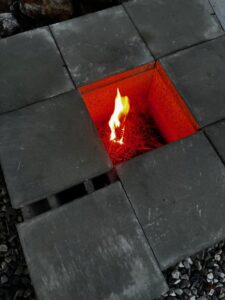 焚き火台置き場を掘り下げたことで、燃焼効率アップで炎が大きくなっても上部に大きくはみ出しにくくなっていると思います。